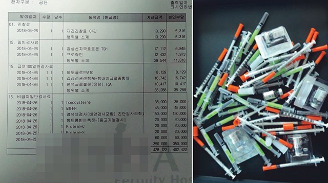 “건보 적용 후 비급여 부분이 늘어 시술 비용 부담이 커졌다”고 호소하는 난임 여성이 보낸 병원 영수증과 시험관 시술을 위해 필요한 과배란 주사기.