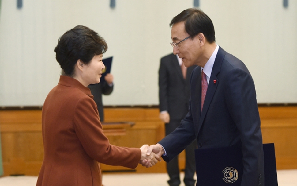 2015년 12월10일 김수남 전 검찰총장이 청와대에서 박근혜 전 대통령에게서 임명장을 받은 뒤 악수하고 있다. 청와대사진기자단
