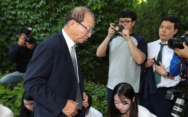양승태 전 대법원장이 6월1일 경기도 성남시 수정구 시흥동 자택 인근 공원에서 재판 거래 의혹과 관련한 기자회견을 마친 뒤 자리를 벗어나고 있다. 한겨레 이종근 기자