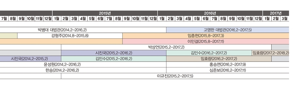 반복되는 이름을 찾으면 ‘승진코스’가 보인다. ‘사법행정권 남용 의혹 관련 특별조사단’의 문건에 빈번하게 등장하는 ‘임종헌’의 직책. ‘법원행정처 차장’은 ‘대법관 0순위’로 인식된다. 차관급인 기획조정실장, 사법지원실장, 사법정책실장도 법원장→행정처 고위직→대법관으로 이어지는 승진 코스의 ‘요직’이다. 법원행정처와 독립된 조직인 양형위원회도 실상은 법원행정처 입김에서 자유롭지 않다. 양형위 상임위원은 ‘양형 실장’으로 불리며 법원행정처 회의에 참여한다. 이규진 양형위 상임위원은 양 전 대법원장의 사법행정에 비판적인 판사들의 동향을 파악하거나 회유했다. 법원행정처 고위직 지시에 따라 재판 거래 의혹을 낳은 문건 작성에 가담한 ‘심의관’들은 법관 경력 10년 안팎의 판사다./