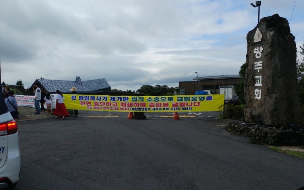 법원이 임장원 담임목사 해임무효 판결을 내리자, 방주재단 쪽이 9월2일 교회 폐쇄한다는 펼침막을 내걸고 교인들의 교회 출입을 막았다. 방주교회 제공