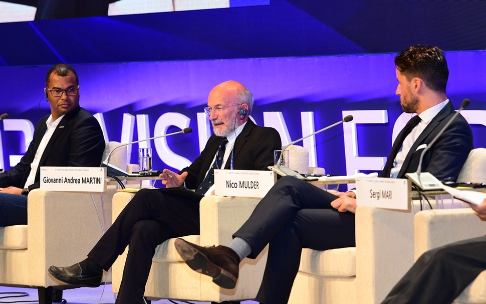 이탈리아 베네치아 시의회의 조반니 마르티니 의장(사진 가운데)이 9월18일 서울 중구 신라호텔에서 열린 유엔관광기구의 제7차 세계도시관광총회에서 베네치아가 겪는 오버투어리즘의 고통을 설명하고 있다. 서울관광재단 제공