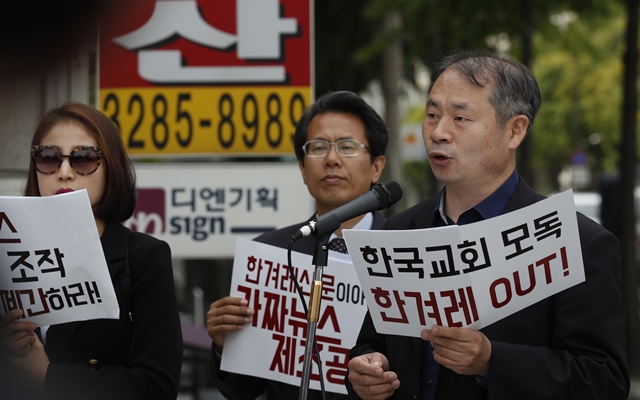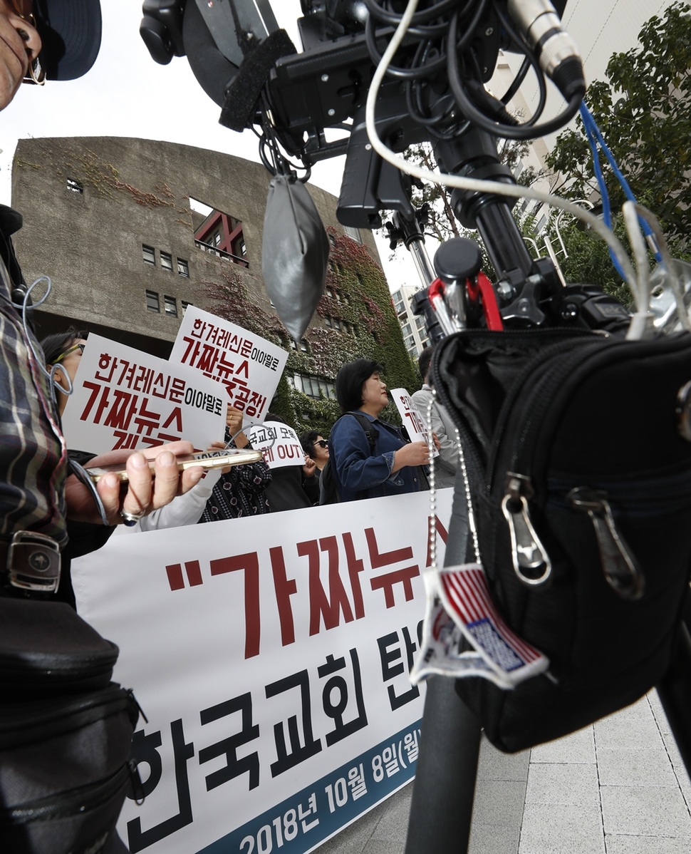 반동성애기독시민연대 소속 회원들이 10월8일 낮 서울 마포구 공덕동 한겨레신문사 앞에서 “가짜뉴스의 발원지는 에스더기도운동”이라는 <한겨레>와 <한겨레21> 공동기획 보도를 반박하는 집회를 하고 있다.