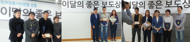 1월, 7월, 8월 민언련 '이달의 좋은 보도' 수상 (왼쪽부터).