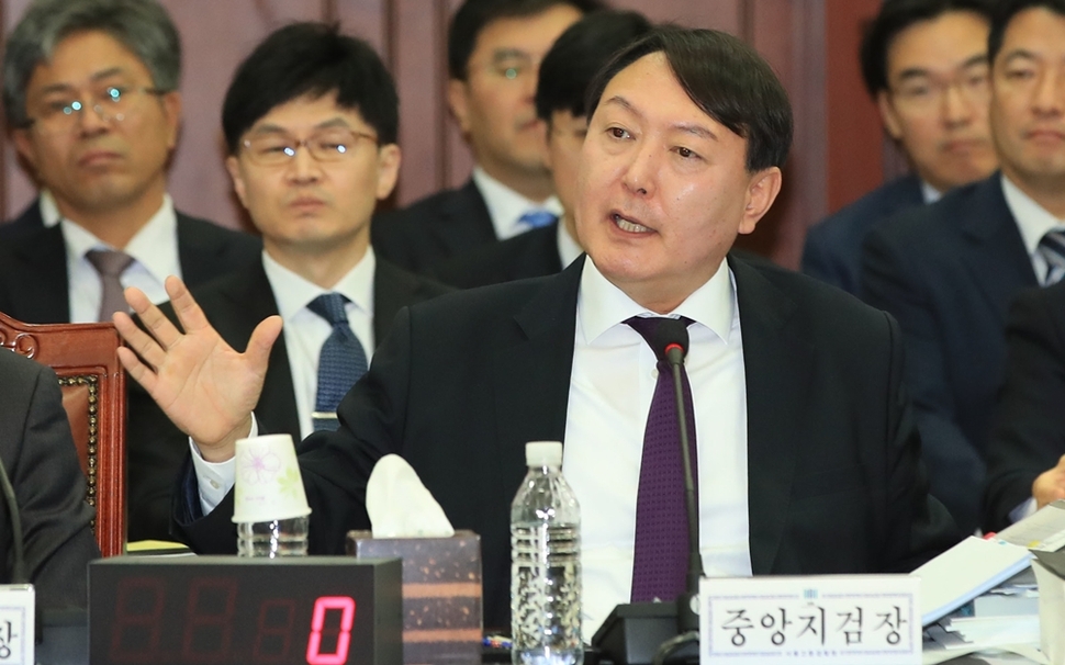 윤석열 서울중앙지검장이 10월19일 서울고검에서 열린 국회 국정감사에서 의원의 질의에 답변하고 있다. 연합뉴스