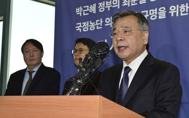 2017년 3월6일 박영수 특별검사가 국정 농단 사건의 수사 결과를 발표하고 있다. 윤석열(맨 왼쪽) 당시 수사팀장이 이를 지켜보고 있다. 사진공동취재단