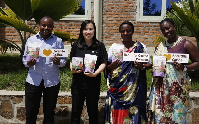 지난 8월 아름다운커피 르완다센터에서 일하는 직원들이 쿠카무 협동조합에서 생산한 커피 ‘킬리만자로의 선물’을 들어 보이고 있다. 맨 왼쪽이 조시아스, 맨 오른쪽이 베스틴. 아름다운커피 제공