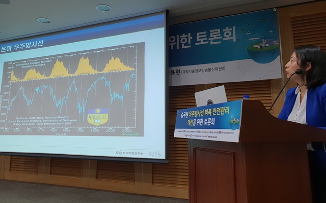 황정아 한국천문연구원 박사가 11월8일 우주방사선 관련 국회 토론회에서 발제하고 있다.