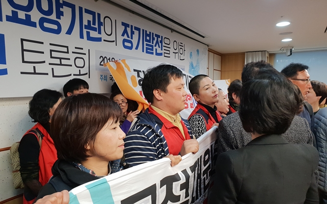 11월14일 국회 토론회에는 500여 명의 요양기관장들이 오제세법을 응원하기 위해 참석했다. 세미나실이 가득 차 바닥에 앉지도 못하고 문밖에 서 있는 기관장도 여럿 있을 정도로 열기가 대단했다. 오 의원이 “재무·회계 규칙 개정으로 민간장기요양기관이 어려움에 처해 있습니다”라고 말하자 우레와 같은 박수가 쏟아졌다. 윤일규(더불어민주당), 김순례·이명수(자유한국당) 의원도 환호성을 받았다. 이 토론회를 무산시키려고 민주노총 서비스연맹 전국요양서비스노동조합의 조합원들이 펼침막을 들고 소리를 질렀지만, 토론회를 1시간 연기시켰을 뿐이다.