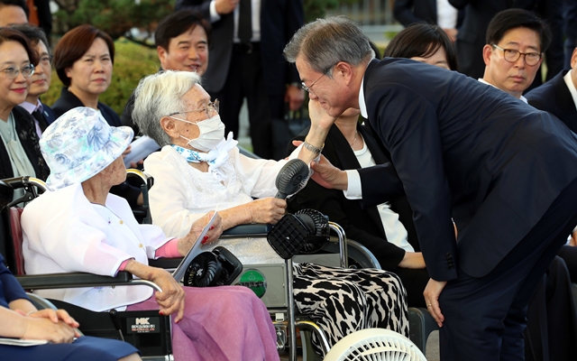 지난 8월14일 오후 충남 천안 국립망향의 동산 안 모란묘역에서 열린 ‘일본군 위안부 피해자 기림의 날’ 첫 기념식에서 김경애 할머니가 문재인 대통령의 볼을 만지고 있다. 한겨레 김정효 기자