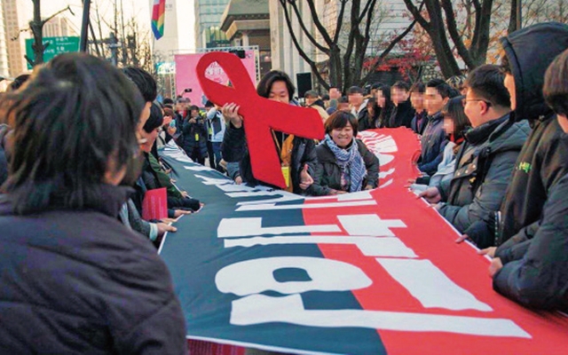 12월1일 ‘세계 에이즈의 날’을 맞아 HIV/AIDS 인권활동가 네트워크 등이 서울 종로구 세종로공원에서 ‘HIV/AIDS 혐오·차별선동 규탄 집회’를 하고 있다. HIV/AIDS 인권활동가 네트워크