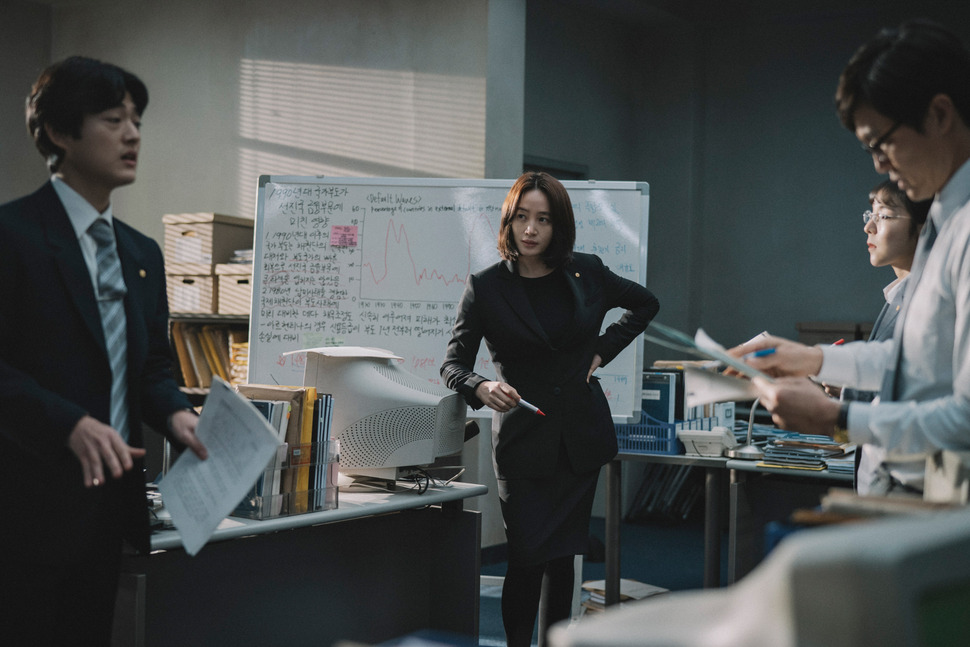 엄 작가를 놓고 이런 소문이 돈 것은 국내에서 주목받기 어려운 ‘경제물’이 꽤 잘 만들어졌기 때문으로 보인다. 미국에선 2008년 세계 금융위기를 다룬 <빅쇼트> 같은 영화가 흥행을 거두면서 이른바 ‘경제 스릴러’가 주목받았지만 국내 관객에겐 생소한 장르다. <국가부도의 날>은 각종 경제지표들이 악화되면서 국가부도의 순간이 엄습하는 과정을 세밀하게 그려냈다. 영화에서 많이 등장하는 어려운 경제 용어가 자칫 피로감을 높일 수도 있었지만 간결한 설명으로 관객의 이해를 돕는다.
