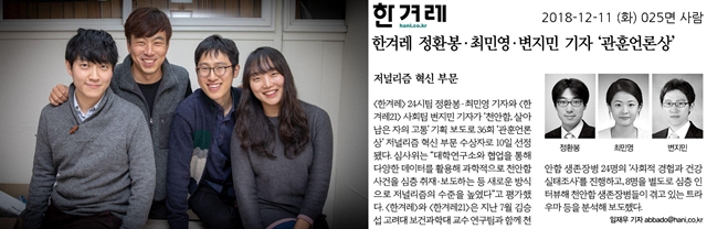 <한겨레21>에 이런 우스개가 있습니다. 변지민 기자는 기사 쓰는 시간 반, 상신하는 데 쓰는 시간 반. 상신은 포상을 신청하는 것을 말합니다. 변지민 기자가 또 상을 받았습니다. ‘천안함 살아남은 자의 고통’ 보도로 관훈언론상을, ‘가짜뉴스 뿌리를 찾아서’ 보도로 무지개인권상을 받았습니다. 무지개인권상은 한국게이인권운동단체 친구사이가 성소수자 인권 향상에 기여한 보도와 단체에 주는 상입니다. 두 보도는 모두 신문 <한겨레>와 협업한 것인데요, 사진을 보면 아시겠지만 천안함의 정환봉, 가짜뉴스의 김완 두 기자 모두 <한겨레21> 출신이라는 사실!