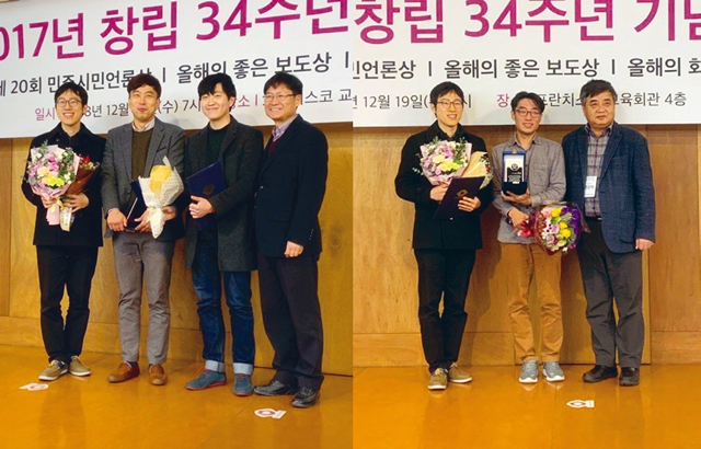 또다시 변지민 기자의 수상 소식입니다. 12월19일 열린 민주언론시민연합 연말 시상식에서 변지민 기자는 가짜뉴스 기획(제1231호 ‘불신과 하나님으로 장사하는 가짜뉴스’)으로 ‘민주시민언론상 본상’(사진 왼쪽)을 받았습니다. 하나만이 아닙니다. 천안함 생존 장병 보도(제1211호 ‘살아남은 게 죄입니까’)로 ‘올해의 좋은 신문 보도’(오른쪽)상도 받았습니다. 민언련 역사상 한 기자가 같은 시상식에서 두 차례 상을 받는 것은 최초라고 하는데, 2019년 변지민 기자와 <한겨레21> 기자들이 경신할 새로운 기록도 기대해주세요!