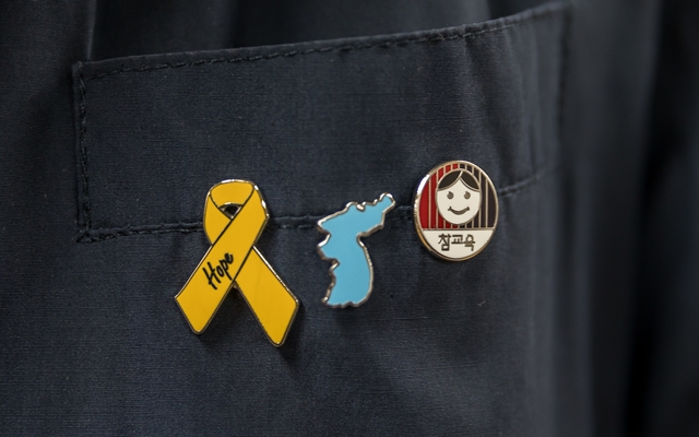 권정오 전국교직원노동조합 위원장이 외투에 나란히 달고 있는 세월호·한반도·전교조 배지.