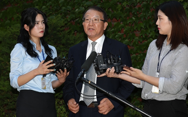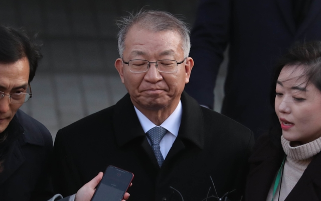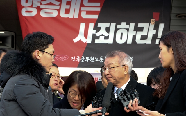 양 전 대법원장이 2019년 1월11일 검찰 소환에 앞서 대법원 앞에서 입장을 밝히고 있다. 한겨레 김정효 기자