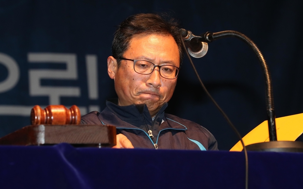 김명환 민주노총 위원장이 정기 대의원대회에서 경사노위 참가와 관련해 발의된 수정안이 모두 부결된 뒤 굳은 표정을 짓고 있다. 강창광 <한겨레> 기자
