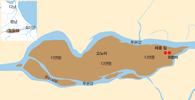 구글맵에서 고노이(Gò Nổi)를 검색하면 가로로 길게 누운, 사람 입술을 닮은 섬의 형상과 만난다. 인구는 1999년 기준 2만5729명. 면적은 서울 여의도의 10배에 이르는 35㎢. 행정구역상 주이쑤옌현(군) 주이쩌우사(읍), 디엔반시 디엔꽝사, 디엔쭝사, 디엔퐁사가 서쪽에서 동쪽으로 펼쳐져 있다. 호이안이 속한 꽝남성(도) 소속이다. 레흥 할아버지의 집은 동쪽 디엔반시 디엔퐁사 안하촌이다. (디엔반은 최근 시로 승격. 뒤에서 1960년대 상황을 설명할 때는 현으로 표기.)