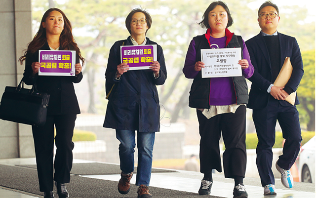 장하나 활동가(전 공동대표·왼쪽에서 두 번째) 등 ‘정치하는 엄마들’ 관계자들이 3월5일 한국유치원총연합회와 소속 유치원을 고발하기 위해 서울시 서초동 서울중앙지검 청사에 들어서고 있다. 연합뉴스