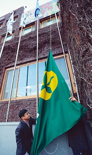 2017년 2월14일 광주 북구청 공무원들이 새마을기를 내리고 있다. 연합뉴스
