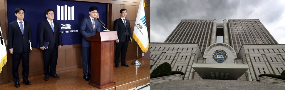 한동훈 서울중앙지검 3차장(가운데)과 사법 농단 수사팀 검사들이 2월11일 중간수사 결과를 발표하고 있다(왼쪽 사진). 사법 농단 재판이 열리는 서울중앙지법 청사. 한겨레 박종식 기자, 이정우 선임기자