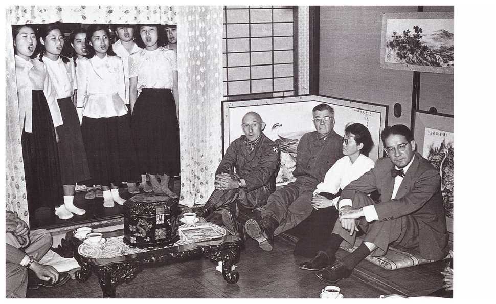사진❶은 이경모가 국방부 정훈국 사진대 문관을 그만두고 한국사진신문사 사진부장으로 활동할 때 찍은 것이다. 정통 르포르타주 형식이 두드러지는 이경모 사진답게 사진 속 구도와 피사체들이 저마다 이야기를 속삭이듯 말을 걸고 있다. 이기붕 국방장관 취임 축하를 위해 박마리아가 초대한 주한 미국대사와 미8군 수뇌부, 그리고 문 밖에서 노래하는 여학생들을 포착하고 있다. 적산가옥을 개조한 것으로 보이는 국방장관 관사 안방에 이기붕의 아내 박마리아가 흰저고리 검정치마 차림으로 앉아 있고, 그 옆에 존 무초 주한 미국대사와 콜트 미8군 부사령관이 앉아 있다. 화각이 넓지 않아 얼굴이 보이지 않지만, 사진 왼쪽에는 이기붕 장관(시계를 찬 손목)과 양옆으로 밴 플리트 미8군 사령관과 김활란이 앉아 있었다. 군과 외교의 최고위층 인사들이다. 안방에 신발을 신고, 게다가 발(군화)을 쭉 뻗은 자세를 보고 종속적인 한-미 관계를 절묘하게 포착했다는 해석을 둘러싸고 논쟁이 있었다. 그러나 난 적산가옥이 자아내는 (탈)식민주의적 장소성과 “여흥을 돋우기 위해” 문 밖에 서서 “팝송”을 부르는 “이화여대 학생”들의 모습에 더 눈이 간다. 이를 두고 한-미 관계를 촉진한 민간 외교로 보고 넘어갈 수 있을까? 분명한 건 김활란·모윤숙·박마리아 등 여성 지도자들이 이승만 대통령의 지시로, 또는 스스로 청원해 학생들을 동원하는 것에 당시에도 사회적 시선과 여론이 곱지 않았다는 거다. 직접적인 성적 유흥을 제공했든 안 했든 말이다.