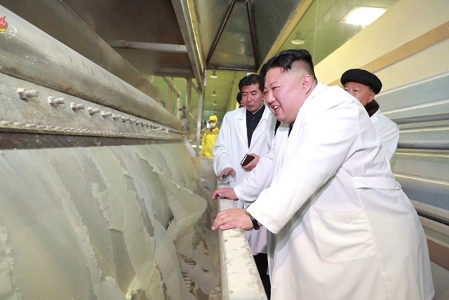 북한 <조선중앙TV>가 4월4일 김정은 국무위원장이 삼지연 감자가루생산공장을 둘러보는 모습을 보도했다. 연합뉴스