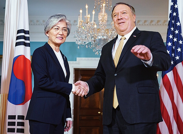 강경화 외교부 장관(사진 왼쪽)이 3월29일 워싱턴 국무부에서 마이크 폼페이오 국무장관과 악수하고 있다. 연합뉴스