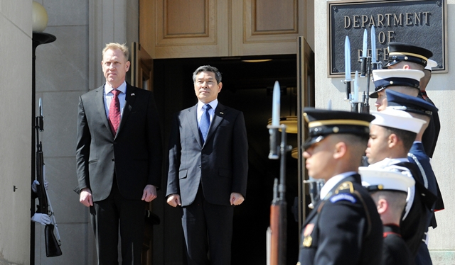 정경두 국방부 장관(사진 가운데)이 4월1일 미국 워싱턴 국방부 청사에서 패트릭 섀너핸 국방부 장관 대행과 환영 의장 행사를 하고 있다. 연합뉴스