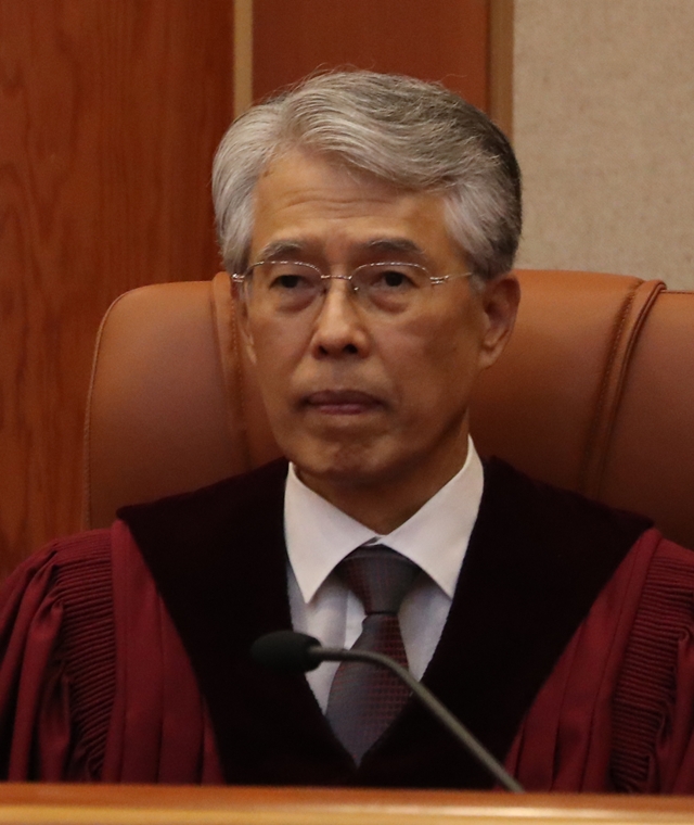 조용호 헌법재판관이 2018년 6월28일 양심적 병역거부 처벌 위헌 선고를 위해 헌법재판소 대법정에 앉아 있다. 조 재판관은 낙태죄 위헌소송 주심을 맡고 있다. 한겨레 김정효 기자