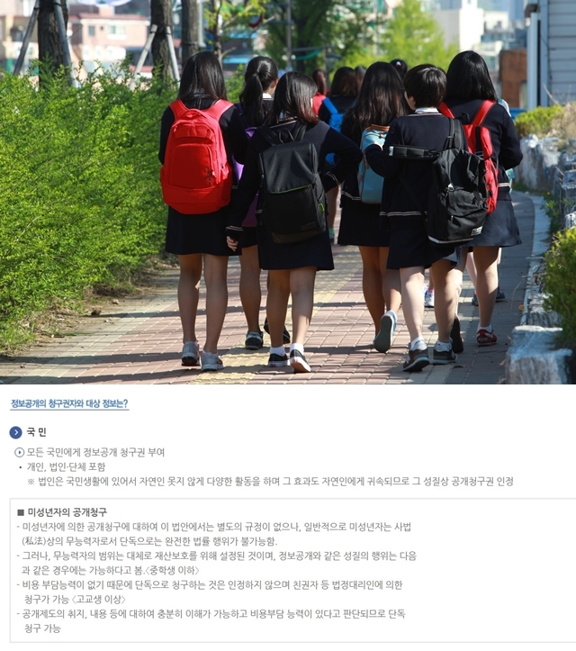 더 심각한 점은, 행안부에서 운영하는 ‘정보공개포털’(www.open.go.kr)은 만 14살 미만은 아예 가입조차 할 수 없다는 것이다. 현재 국회와 사법부를 제외한 대부분의 정부 부처와 지자체 등의 정보공개 청구는 정보공개 포털을 이용하는데, 만 14살 미만은 온라인 정보공개 청구가 애초에 불가능한 셈이다. 네이버 등 포털 사이트가 보호자의 휴대전화 인증 등을 거쳐 가입할 수 있는 것과 상반된다. 행안부 관계자는 “현재 기술 시스템상 법정대리인의 동의를 받았다는 걸 확인할 수 없다. 14살 미만 아동은 법정대리인의 동의서를 첨부해 해당 지자체나 기관에 가서 청구할 수 있다”고 말했다. 법적으로 정보공개 청구에 제한을 받는 대상은 아님에도 만 14살 미만은 온라인 정보공개라는 간편한 방법을 두고도 우편이나 팩스, 현장 방문 같은 번거로운 방법을 택할 수밖에 없다. 예를 들어 은진이가 정보공개 청구에 나이 제한을 둔 경상북도 청도군의 행정정보를 알고 싶다면, 청도군청에 찾아가거나 우편, 팩스로 접수시킬 수밖에 없다. 포털 사이트가 대리인 인증을 거치면 만 14살 미만도 가입을 허용하는 부분에 대해서도 행안부 관계자는 “정보공개 청구는 공개되는 정보가 본인 확인이 필요한 경우가 있고, 일반적으로 공개되는 정보면 상관없지만, 공개 정보로 이익을 보거나 손해를 보는 이가 있어 네이버 같은 포털과 다르다”고 말했다. 하지만 이는 국민의 알 권리라는 기본권을 침해한다는 지적이다. ‘민주사회를 위한 변호사모임’(민변)에서 활동하는 송기호 변호사는 “미성년자라 하더라도 본인이 다니는 학교 등에 알 권리가 있는데 법률에 근거 없이 제한하는 것은 기본권을 침해하는 것”이라고 말했다. 또한 은평구청 등에서 비용 부담을 이유로 중학생은 단독 청구 불가, 고등학생은 가능이라고 표기한 부분에 대해서도 “정보공개법 제17조 2항을 보면 공공 목적으로 청구하는 것은 비용 부담을 감면하도록 하고 있다. 또한 미성년자라도 본인의 이익을 위해 금전을 지출할 권리가 있어서 미성년자가 비용을 내는 데는 아무런 법적 장애가 없다”고 밝혔다. 주민번호 삭제하라 만 14살 미만의 정보공개 청구를 제한하는 근거로 삼는 개인정보보호법 제22조 6항의 내용은 “만 14살 미만의 아동의 개인정보를 처리하기 위하여 이 법에 따른 동의를 받아야 할 때에는 그 법정대리인의 동의를 받아야 한다”이다. 현재 정보공개 청구를 할 때 주민등록번호를 쓰게 하는데 만 14살 미만 아동은 이 주민등록번호를 이용할 때 법정대리인의 동의를 받아야 한다는 것이다. 시민단체들은 그동안 개인정보 유출 등의 우려가 있다며 주민등록번호를 의무적으로 쓰는 조항을 삭제해야 한다고 주장해왔다. 현재는 공공기관에 정보공개를 청구하려면 이름, 주민등록번호, 연락처 등을 쓴 청구서를 내야 한다. 김예찬 활동가는 “정보공개 청구자에게 과도하게 개인정보를 요구함으로써 정보공개 청구자가 특정되기 때문에 활동에 제약을 받는다”며 “주민등록번호는 바꿀 수 없고, 청소년의 알 권리를 제한하는 측면에서도 주민등록번호 기입 조항을 삭제해야 한다”고 말했다. 진선미 더불어민주당 의원(현재 여성가족부 장관)이 지난해 7월 주민등록번호 기입을 삭제한 내용을 담은 정보공개법 개정안을 대표 발의했지만 현재 국회에 계류돼 있다. 학내 성폭력 등을 고발하는 ‘스쿨미투’ 운동을 벌여온 청소년 페미니즘 활동가 양지혜씨는 올해 성폭력 가해교사 복직률 같은 정보공개를 청구할 계획이다. 양 활동가는 “현재 가해 교사의 징계도 고발 학생들은 기사를 보고 아는 경우가 많을 정도로 학생들이 관련 정보를 얻기 열악한 상황이다. 스쿨미투가 전문 지원단체가 아닌 청소년 당사자들 중심으로 진행돼 그동안 정보공개 청구를 생각해보지 못했지만 앞으로 청구할 생각”이라며 “청소년은 당연히 미성숙하고 이해할 수 없다고 생각하는 것은 편견이다. 청소년에게 정보공개 청구를 제한하지 말아야 한다”고 말했다. 장수경 기자 flying710@hani.co.kr