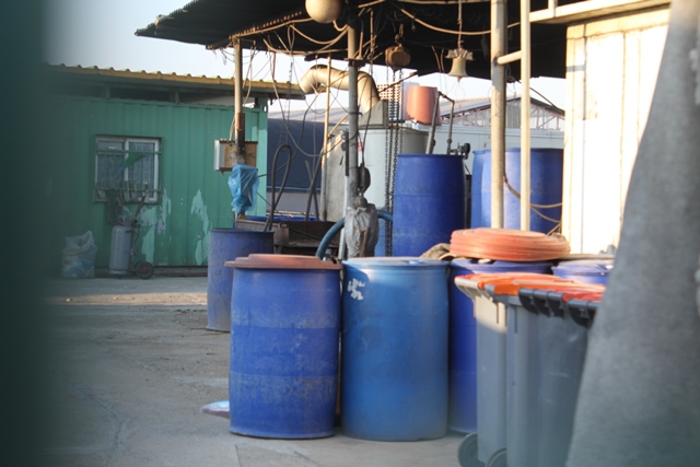 개농장의 문틈 사이로, 개들한테 먹이는 음식물 쓰레기가 담긴 파란색 통이 보인다.