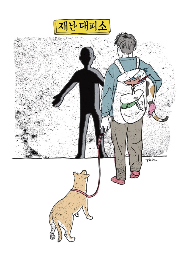 이런 비극을 막을 수 있는 방법이 있다. <한겨레> 보도를 보면 미국은 2005년 허리케인 카트리나 재난 이후인 2006년 ‘반려동물 대피와 운송 기준법’을 통과시켰다. 재난 대응 계획에 동물을 포함하라는 것이다. 이 법이 통과된 뒤 미국 전역에 반려동물과 함께 갈 수 있는 대피소가 늘었다. 이제 한국도 이걸 고민할 때가 됐다. 농림축산검역본부의 2017년 설문조사를 보면 전체 가구 수의 28.1%인 593만 가구가 반려동물을 키운다. 재난이 오면 593만 가구는 대체 어디로 가야 할까. 재난으로부터 대피처가 필요한 것은 인간만이 아니다. 반려동물까지 포함하는 재난 매뉴얼이 지금 우리에게는 절실히 필요하다. 김도훈 <허프포스트코리아> 편집장