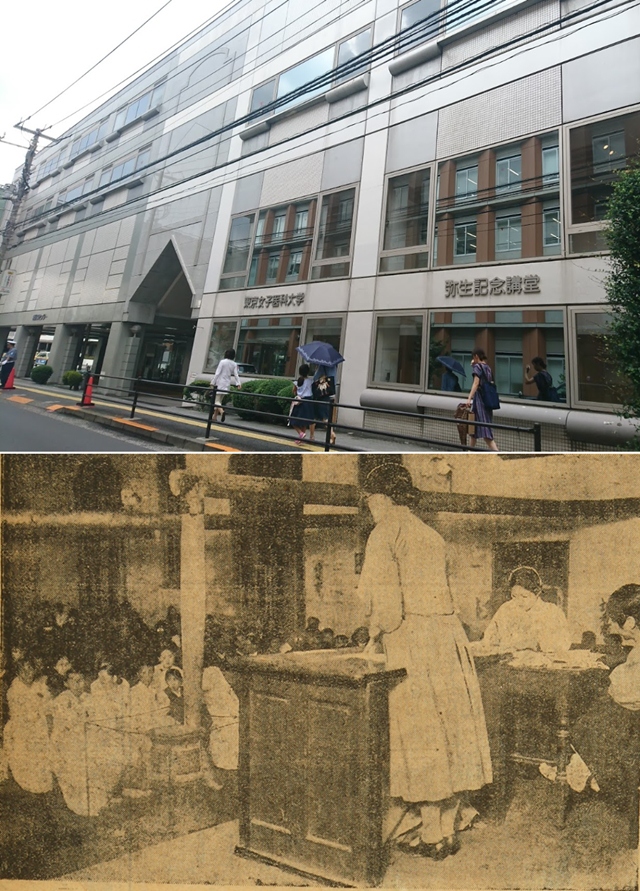 일본 도쿄여자의학전문학교의 후신인 도쿄여자의과대학 정문(위). 이덕요가 집행위원으로 선출된 근우회 경성지회 제3회 정기대회 회의장. 단상에 의장과 서기 2명이 있다. 참석 회원이 80명, 남녀 방청객이 300명이었다.