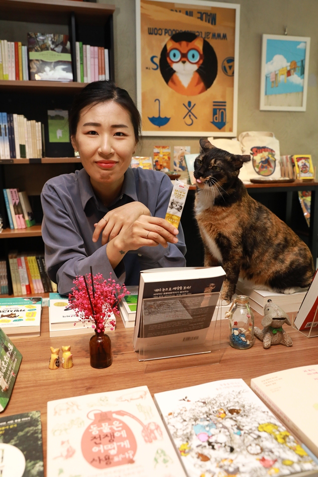 반려동물에 관한 책을 파는 동네책방 ‘동반북스’의 심선화 대표와 반려묘 둥이. 류우종 기자