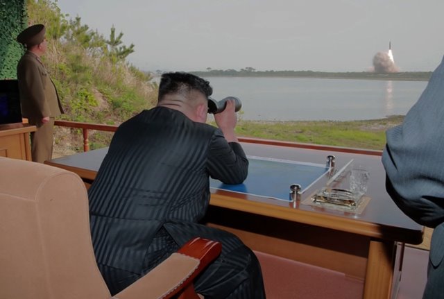 김정은 북한 국무위원장이 지난 5월4일 화력 타격 훈련을 참관하는 모습이 다음날 <조선중앙TV>에서 방영됐다. 연합뉴스