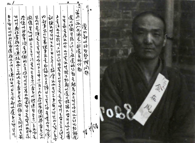 (왼쪽부터) 김재봉의 1925년 12월7일치 비밀편지 첫 페이지. 조선공산당 책임비서 김재봉의 친필 서명. 수감 중인 김재봉, 1928년 1월21일 서울 서대문형무소에서 촬영. 임경석 제공, 국사편찬위원회 제공