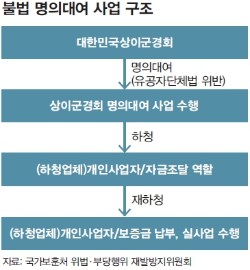 재발방지위는 상이군경회의 전체 수익사업 46개 가운데 절반이 넘는 24개를 불법 명의대여 사업으로 추정했다. 국가유공자단체설립법(이하 유공자단체법) 제17조는 “단체가 직접 생산하는 물품을 구매하거나 해당 단체에 직접 물건을 매각 또는 임대하거나 해당 단체와 용역계약을 체결하는 경우 수의계약으로 할 수 있다”고 돼 있다. 상이군경회는 법률에서 보장하는 수의계약이라는 특혜를 이용해 일감을 나눈다. 그 과정에서 실제 일감을 수행할 업체와 계약한 뒤 명의 수수료를 떼는 방식으로 이득을 챙겼다.