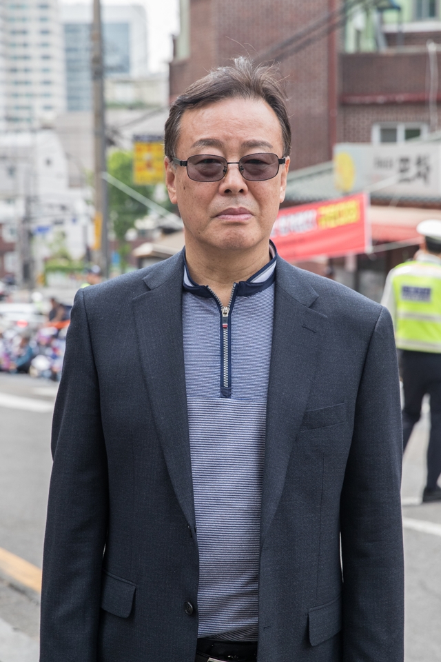 5월8일 한겨레신문사 앞에 선 대한민국상이군경회 불법 명의대여 사업의 피해자 김원일씨. 그의 뒤로 상이군경회원들이 <한겨레21> 보도에 항의하는 집회를 열고 있다. 박승화 기자