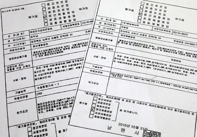 김원일씨 회사와 상이군경회 폐기물사업소의 폐기물재활용업 허가증에 적힌 사업장 주소가 똑같다. 한국전력 폐기물을 공급받을 때는 상이군경회 명의를, 가공한 폐기물을 재판매할 때는 김씨 회사 명의를 이용했다. 김진수 기자