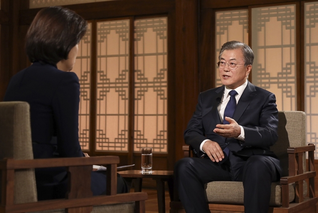 문재인 대통령이 5월9일 청와대 상춘재에서 송현정 KBS 기자가 진행한 특집 대담 ‘대통령에게 묻는다’에 출연했다. 청와대사진기자단