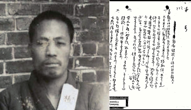 1928년 2월17일 서대문형무소 수감 중 찍은 권오설의 초췌한 모습(왼쪽). 권오설과 김동명이 이면지에 급하게 휘갈겨 쓴 1925년 12월3일 자 조선공산당 제1차 검거 사건 보고서 첫 페이지. 당시 급박한 상황을 잘 보여준다. 국사편찬위원회 제공, 임경석 제공