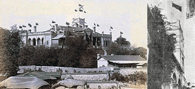 고려공청 중앙집행위원 권오설이 비밀리에 연락을 주고받던 경성 주재 소련총영사관 건물. 한국전쟁 때 건물이 파괴돼 현재는 종탑만 남아 있다(왼쪽). 1925년 9월24일 경성 주재 소련총영사관 적기 게양식. 당시 신문에 “푸른 하늘에 물들인 러시아 국기, 우렁찬 혁명곡에 뱃심 좋게 번득”인다고 대서특필됐다. 한국근대외교사전, 동아일보