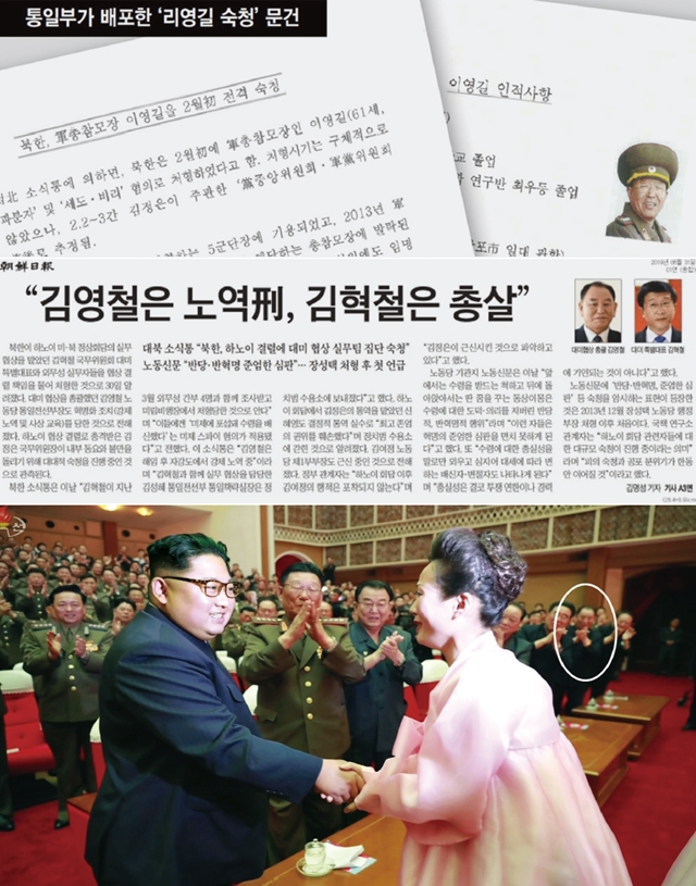 (위부터) 2016년 2월10일 통일부가 배포한 리영길 숙청설 문건. ‘김영철 노역형’ 보도 〈조선일보〉 기사 갈무리. 김정은 북한 국무위원장을 바라보며 박수치는 맨 앞줄 배석자들 사이에 최근 “강제 노역설”이 나왔던 김영철(흰색 원) 노동당 부위원장의 모습이 보인다. 통일부 제공,〈조선일보〉 갈무리, 연합뉴스
