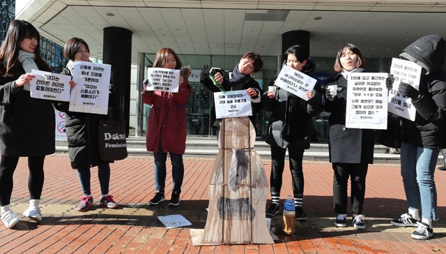 2017년 12일 직장 내 여성혐오 철폐 촉구 기자회견에서 행위극을 하고있다. 한겨레 백소아 기자