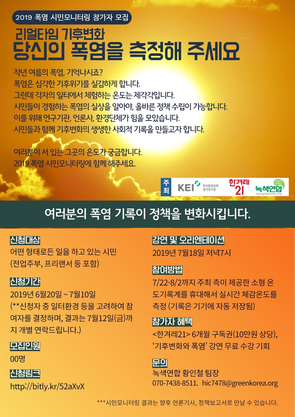 <한겨레21>, 녹색연합, KEI의 ‘2019년 폭염 시민모니터링’은 올해 가장 더울 때인 7월22일부터 8월2일까지 2주 동안 진행됩니다. 참여 방법은 간단합니다. 저희가 나눠드릴 작은 디지털 온도기록계를 일할 때 몸에 붙이고 다니기만 하면 됩니다. 스마트폰의 3분의 1 크기인 디지털 온도기록계는 참여자가 노출되는 온도를 자동으로 기록해줍니다.