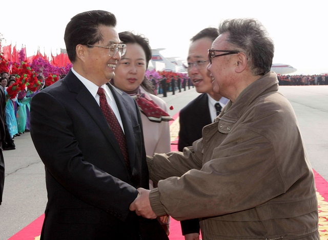 2005년 김정일 북한 국방위원장이 후진타오 중국 국가주석을 평양 순안공항에서 맞이하고 있다. 연합뉴스