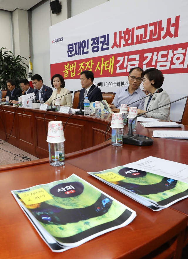 나경원 원내대표 등 자유한국당 의원들이 6월27일 국회에서 ‘문재인 정권 사회교과서 불법 조작 사태 긴급간담회’를 열고 있다. 연합뉴스