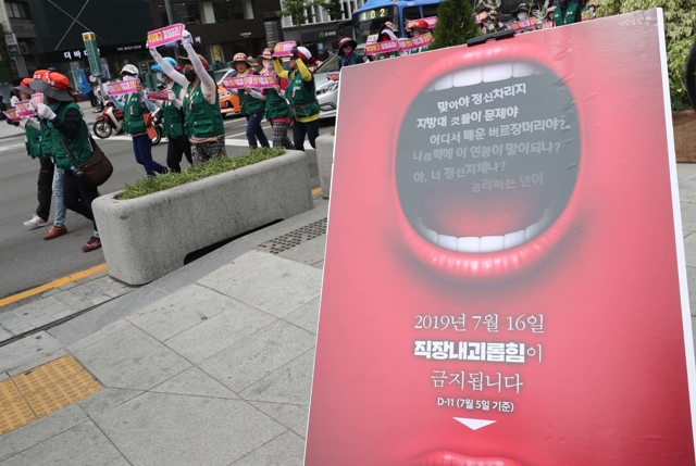 7월17일 서울 광화문광장에서 ‘직장갑질 119’ 회원들이 ‘슬기로운 직장생활’ 캠페인을 하고 있다. 한겨레 백소아 기자