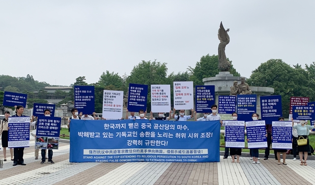 한국에 있는 전능신교 신자들이 7월22일 오전 서울 중구 청와대 분수대 앞에서 ‘중국 사이비 전능신교 피해자 가족’의 가족 찾기 집회·시위가 중국 공산당에 기획된 것이라며 맞불 집회를 열고 있다. 이재호 기자